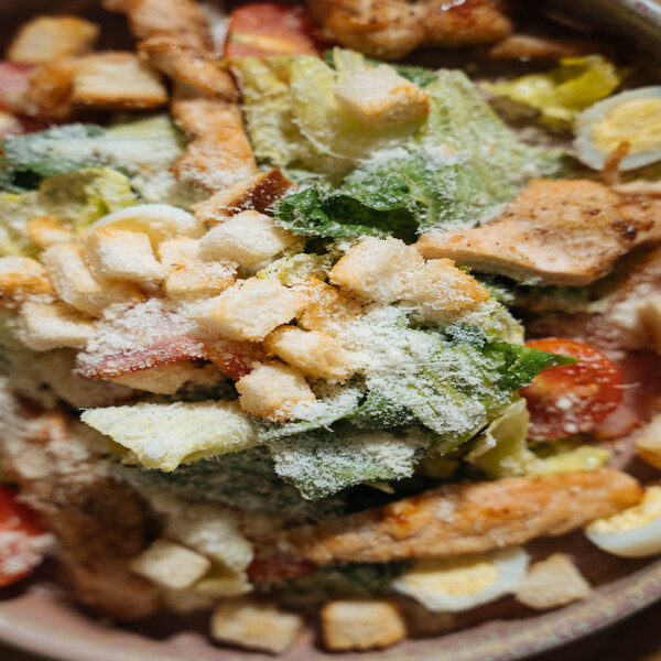 kurczak / mix sałat / jajka przepiórcze / boczek / pomidorki cherry / grzanki / sos cezar / parmezan