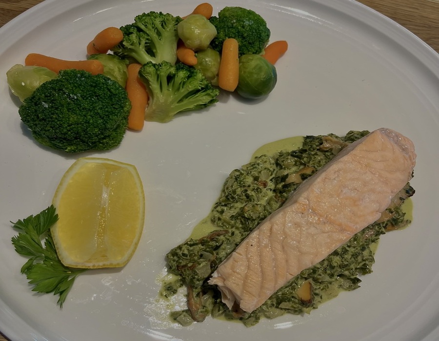 poduszka ze szpinaku z kurkami / warzywa sezonowe na parze / cytryna
