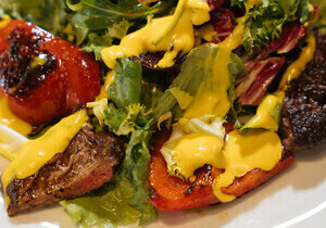 mix sałat, granat, borówka, bób, orzechy, winegret ogórkowy