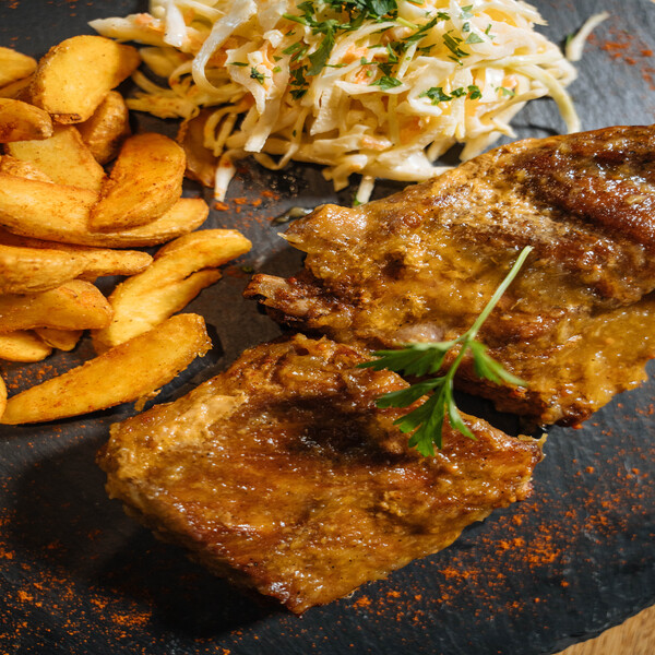 Nuggetsy z kurczaka, frytki, ketchup, marchewka z pomarańczą